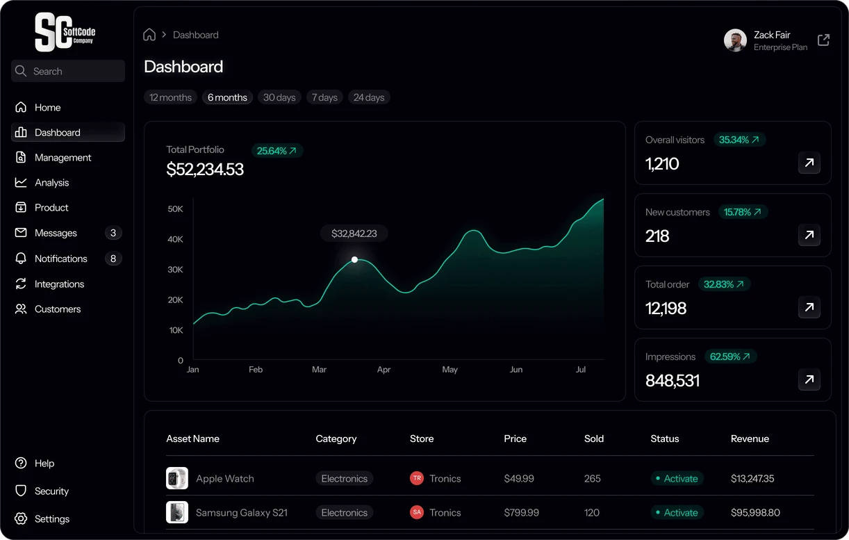 Let SoftCode handle inventory, customer engagement, and order updates automatically. Track real-time performance with intuitive dashboards.